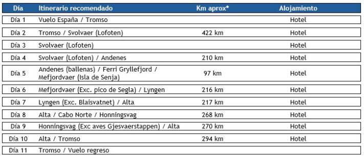 Mañana libre en Tromso. Recomendamos, visitar el puerto de Tromso, el acuario Polaria o el Museo Polar. A una hora prudente, traslado al aeropuerto, devolución del coche y vuelo internacional de regreso a la ciudad de origen (vía punto intermedio). Llegada y fin del viaje.