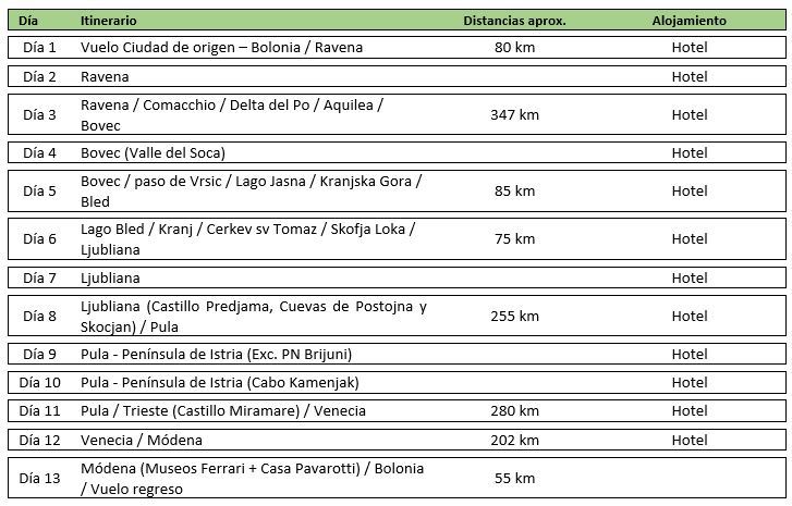 Seguidamente, nos trasladamos al aeropuerto de Bolonia, devolución del coche y vuelo internacional de regreso a la ciudad de origen. Llegada y fin del viaje.