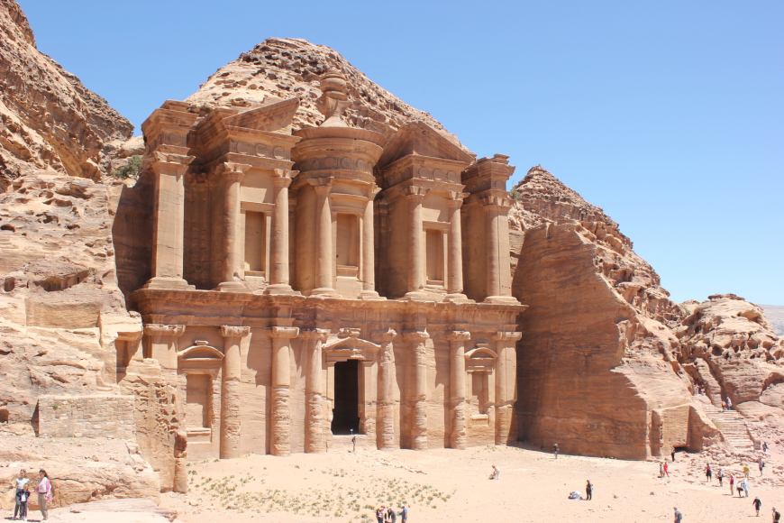 Esta mañana realizaremos un trek desde “Little Petra” hasta Petra. Un recorrido de 12 km que sigue una antigua ruta nabatea que conecta ambos yacimientos. El itinerario transcurre por espectaculares paisajes de piedra, desfiladeros, cornisas, terrazas de piedra natural, etc. Hay algún punto con vistas magnificas (Wadi Siyyagh). Llegaremos a la parte trasera de Petra, encontrando el Monasterio de repente, ante nosotros. Allí nos esperarán los componentes del grupo que no hayan querido hacer esta excursión. Delante del Monasterio hay un café beduino, donde repondremos fuerzas.